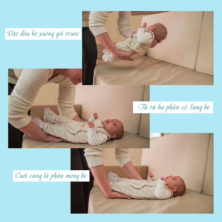 Tuy nhiên, các mẹ nên nhẹ nhàng đặt đầu bé xuống gối trước, sau đó từ từ hạ cổ, lưng của bé xuống giường trong khi một tay vẫn giữ mông của bé.