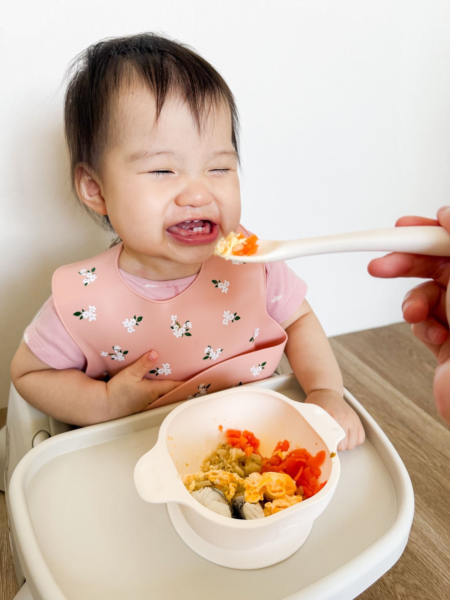 - Máng hứng của yếm rộng giữ lại thức ăn bị rơi, giúp bé sạch sẽ khi ăn.
