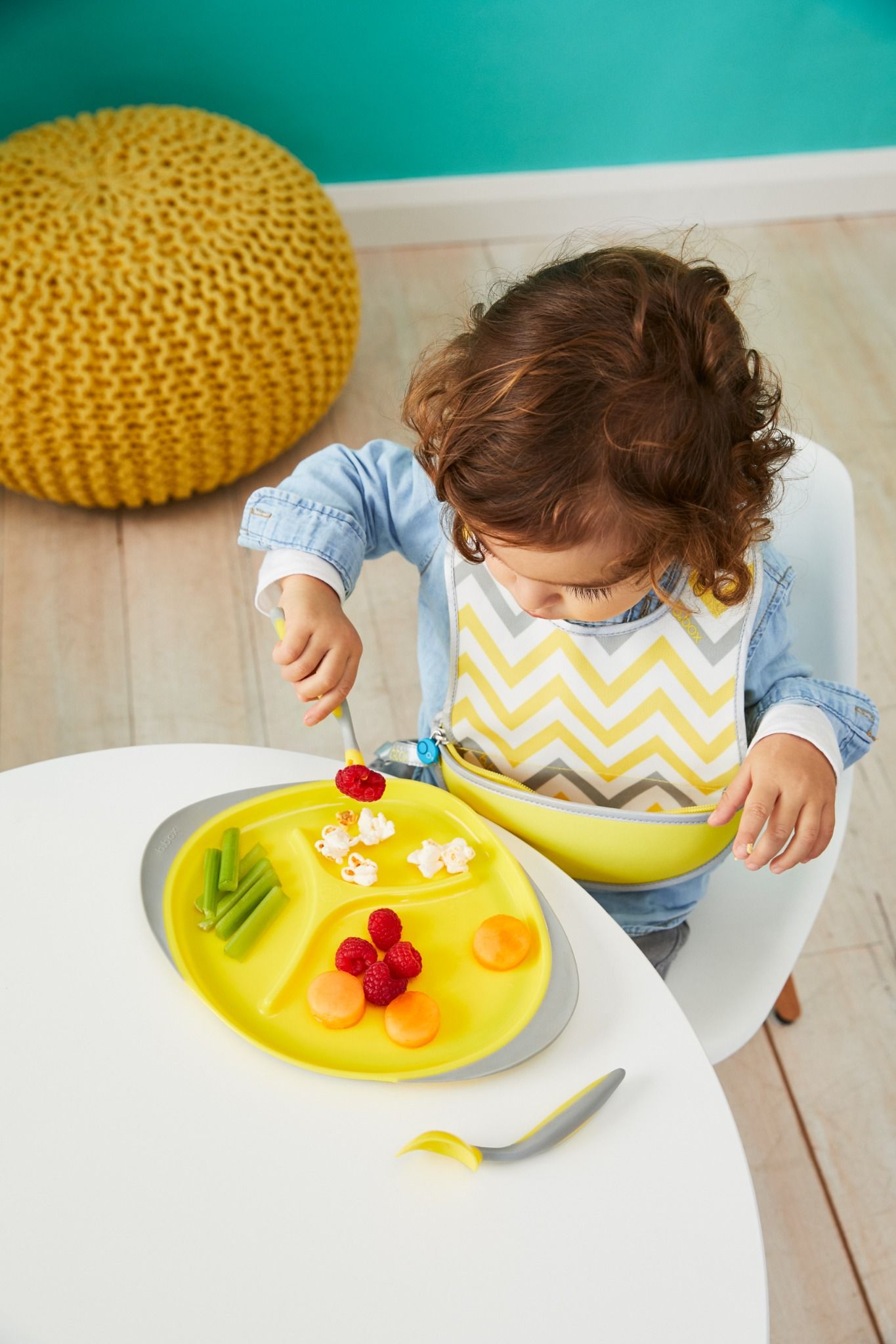 - Muỗng có lòng sâu, cạnh cong cùng đầu nĩa nhỏ với 3 chạc thuận tiện cho bé lấy thức ăn trong chén, dĩa.