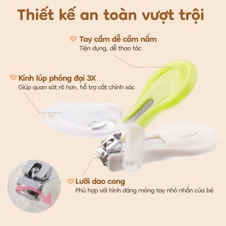 Kính lúp phóng đại x 3: Thiết kế kính lúp có hiệu ứng khuếch đại móng tay của bé lên gấp 3 lần, giúp việc cắt móng tay cho bé trở nên dễ dàng và an toàn hơn.