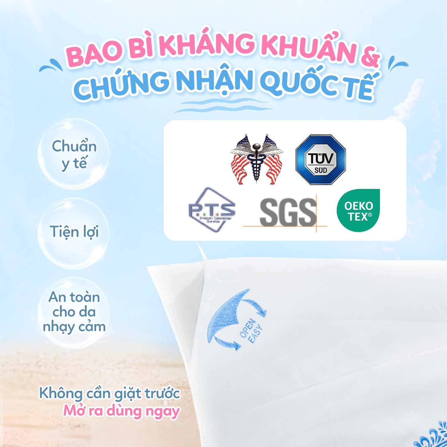 Đóng gói bằng bao bì kháng khuẩn y tế: Bao bì này giữ khăn luôn sạch sẽ và không bị oxy hóa. Vì thế, mở bao bì ra là dùng khăn được ngay mà không cần giặt trước. Cực kỳ tiện với các mẹ bầu chuẩn bị đi sinh.