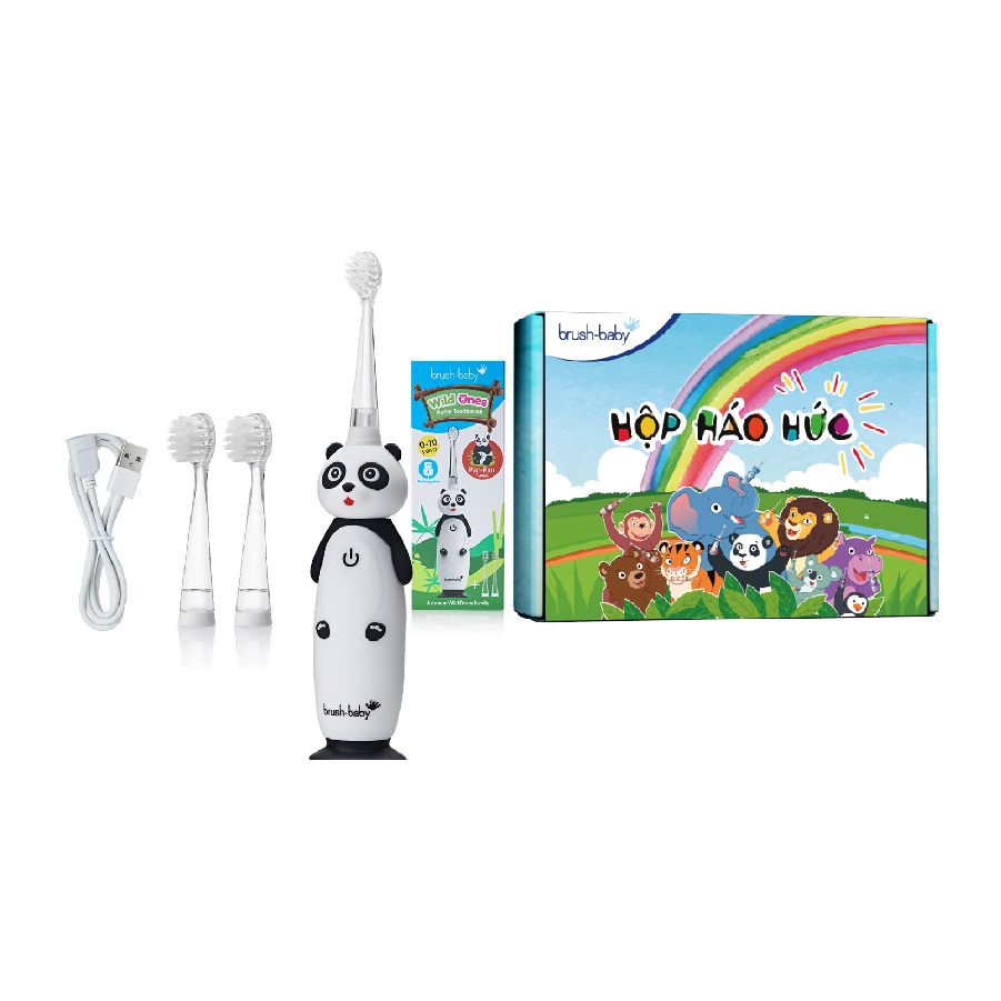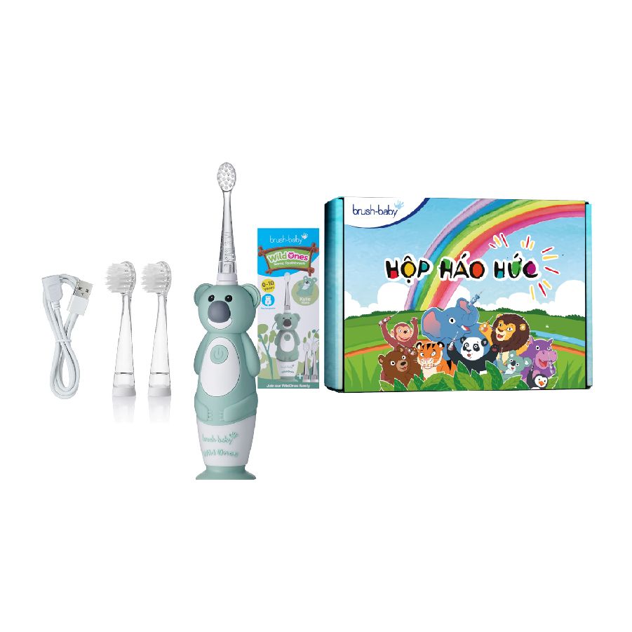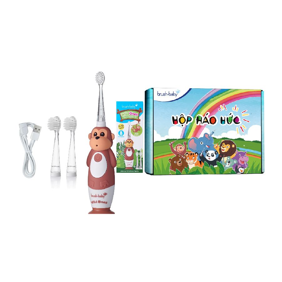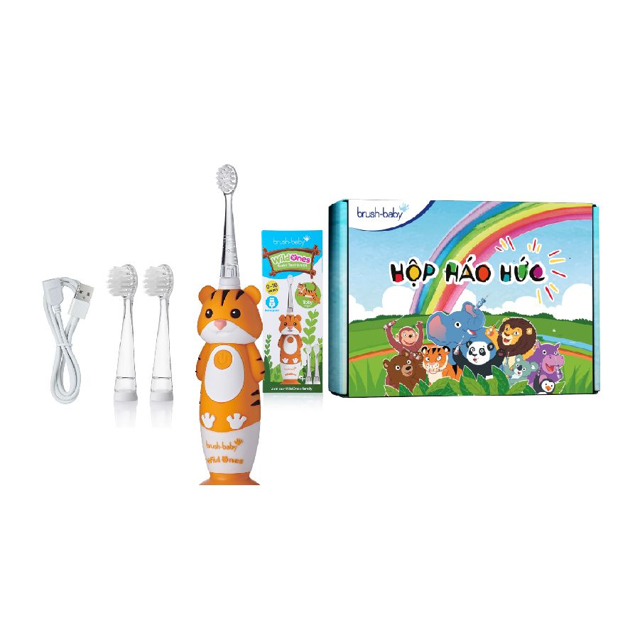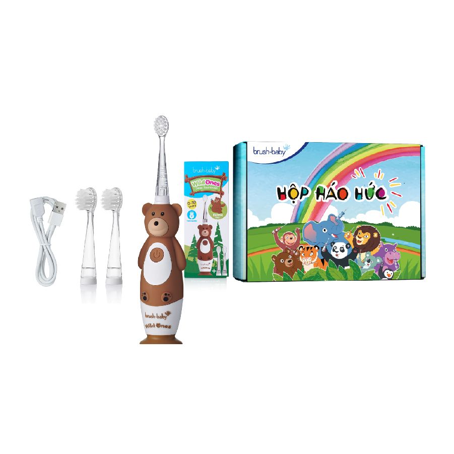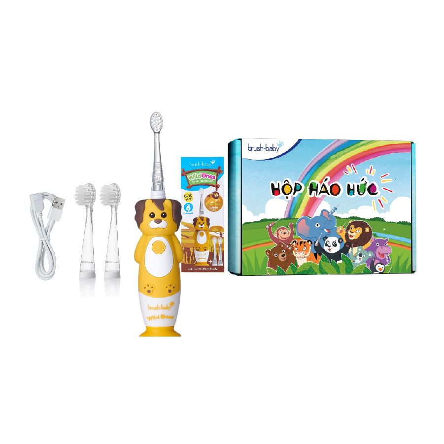 - Bộ bàn chải điện WildOnes gồm 1 bàn chải hình động vật đáng yêu, 2 đầu bàn chải thay thế và 1 dây sạc USB, với các ưu điểm: