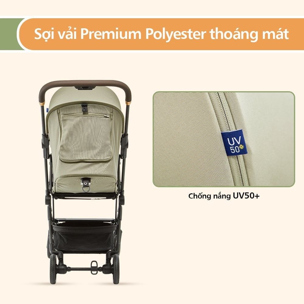 - Mái che chống tia UV và chống thấm nước, giúp chống nắng hiệu quả và bảo vệ bé khỏi những cơn mưa nhỏ khi ở ngoài trời. Mái che có thể mở rộng hoặc xếp gọn lại dễ dàng. Đặc biệt, mái che có 1 đoạn lớp lưới ẩn dưới khóa kéo, có thể mở rộng thêm mái che khi cần thiết để che bé kín đáo hơn mà vẫn đảm bảo thông thoáng cho bé.